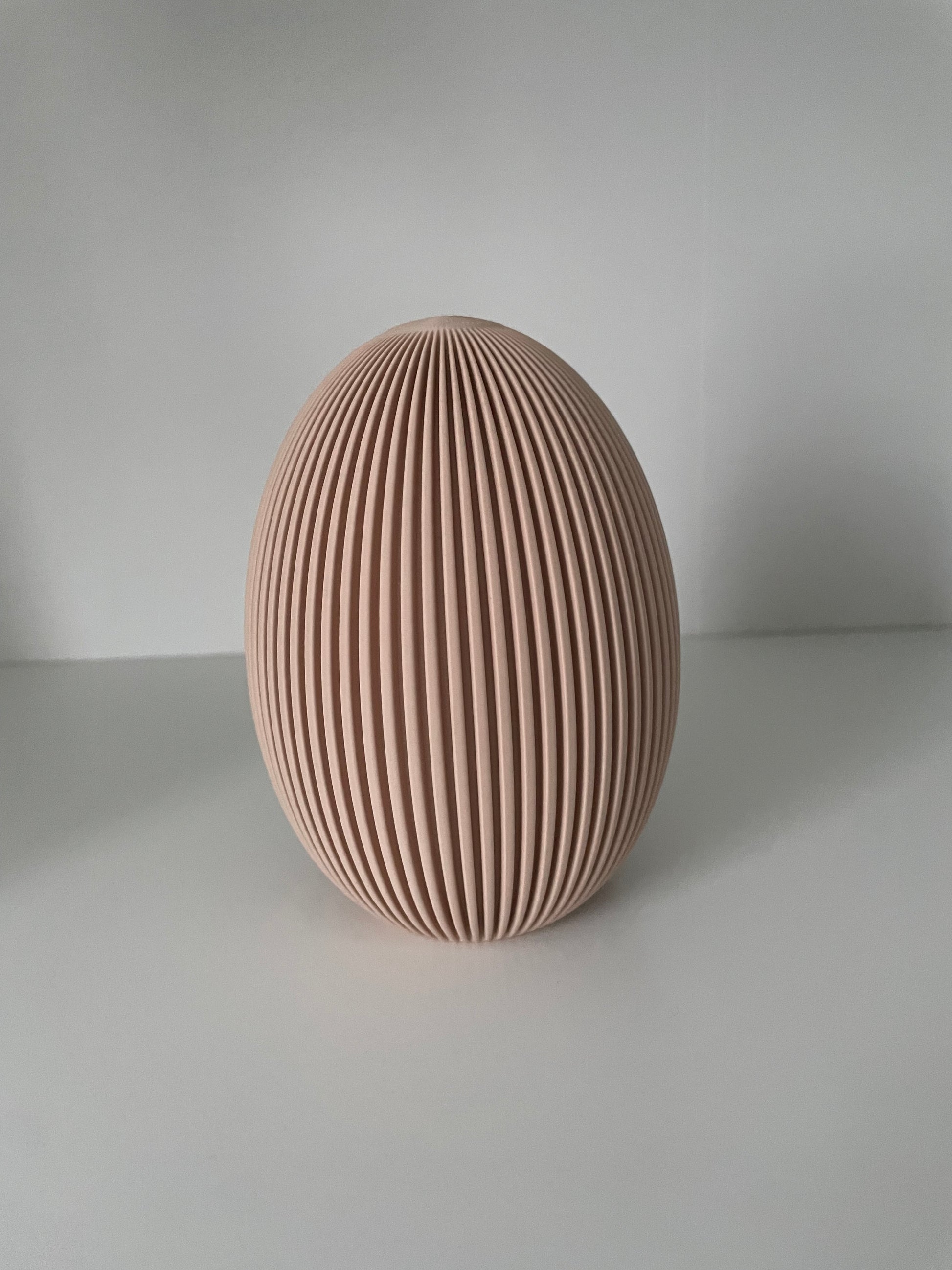 „Muna“ ist ein modernes Deko-Objekt aus dem 3D-Druck und interpretiert die klassische Eiform in einer klaren, zeitgemäßen Designsprache. Die gleichmäßige, vertikale Oberflächenstruktur verleiht dem Objekt eine ruhige, elegante Ausstrahlung. Ideal als stilvolles Wohnaccessoire, als Osterdekoration oder als dezenter Blickfang auf dem Sideboard, im Regal oder auf dem Esstisch.